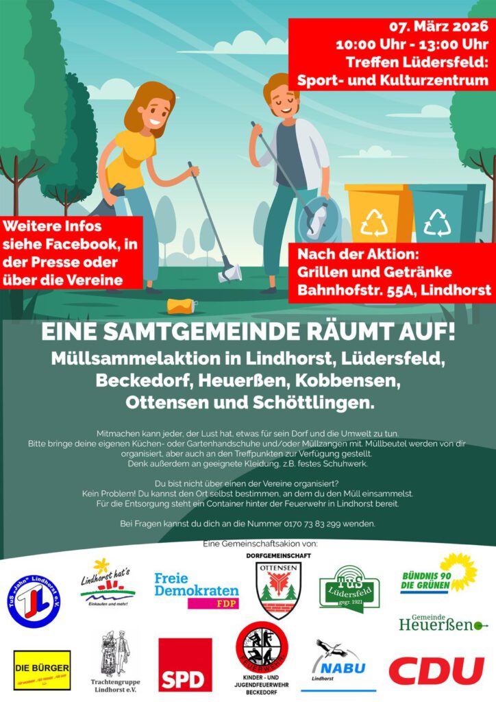 Treffpunkt für Lüdersfeld ist das Sport- und Kulturzentrum. Von dort aus werden wir in Gruppen losziehen und achtlos weggeworfenen Müll einsammeln. Ziel ist es, unsere Orte – darunter Lindhorst, Lüdersfeld, Beckedorf, Heuerßen, Kobbensen, Ottensen und Schöttlingen – ein Stück lebenswerter zu machen.